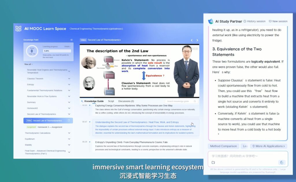 Another highlight was the first global launch of the new concept of “Intelligent MOOCs.” As a novel model, Intelligent MOOCs define a new course paradigm that leverages intelligent technologies to reshape the entire process of teaching, learning, management, and assessment, offering an innovative approach to enabling large-scale personalized education. Tsinghua University’s Chemical Engineering Thermodynamics course was featured among the first batch of Intelligent MOOCs.